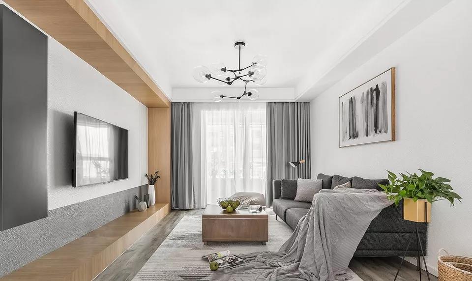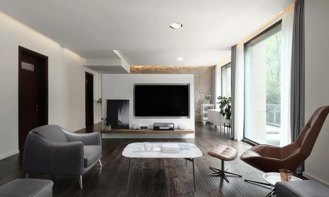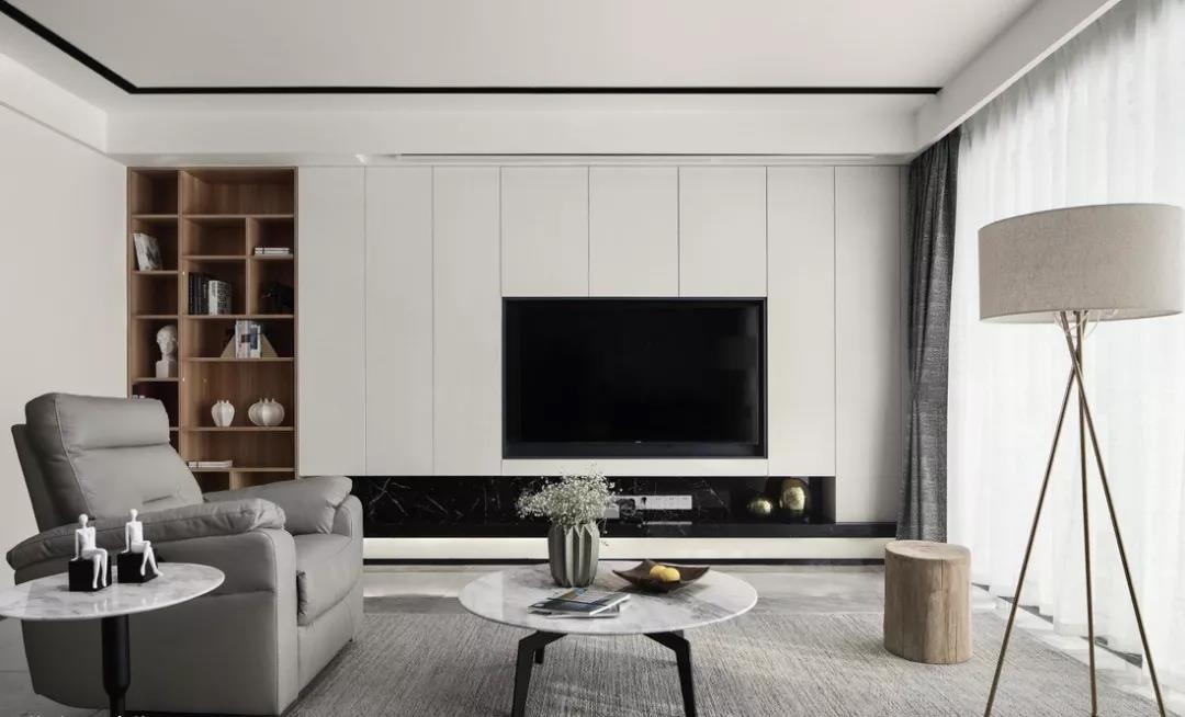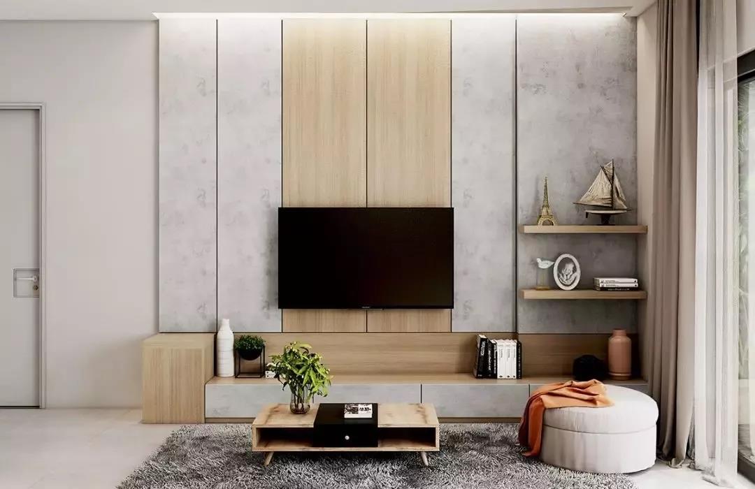 然而,隨著極簡主義思潮的風(fēng)靡,以及電視自身存在感的大大削弱,人們的家裝觀念也受到了一定影響,開始崇尚「去繁從簡」,不做繁復(fù)的修飾與設(shè)計,讓電視背景墻變得實用、美觀起來。