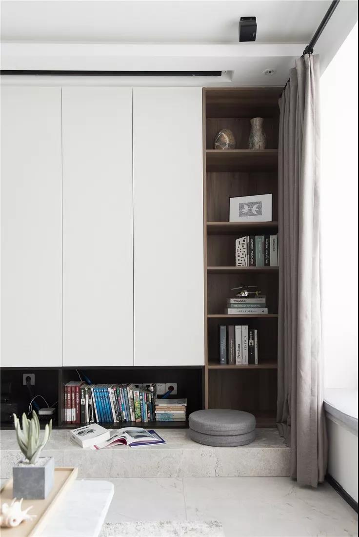 不規(guī)則的轉(zhuǎn)角改成抽屜地柜+墻柜一體,兼具收納和休閑功能。