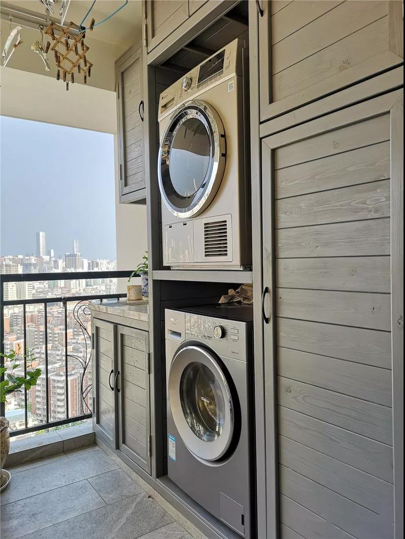 外面正對花園陽臺,設(shè)計洗曬區(qū),陽臺沒有封,特意用防腐木打的收納柜,風吹日曬雨淋也不怕。