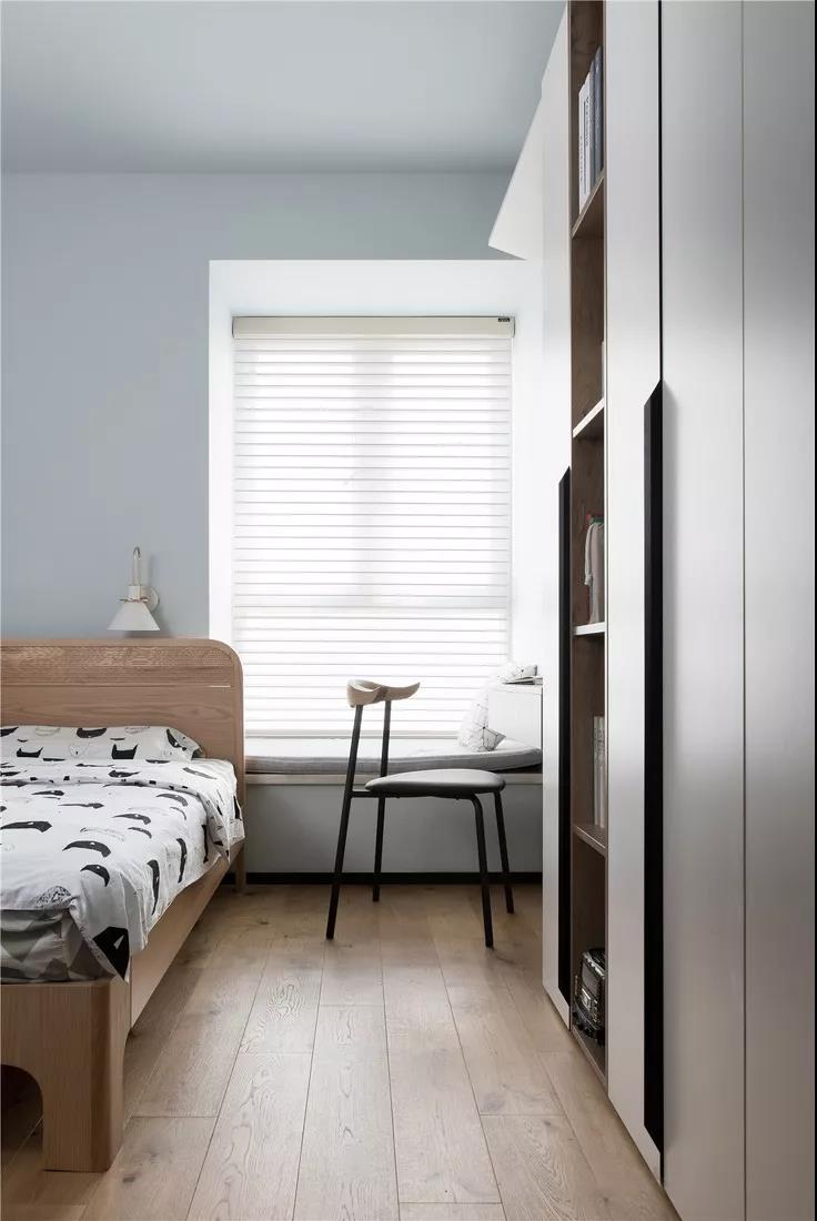 細腿床方便了掃地機器人的日常打掃,木凳式床頭柜很別致。