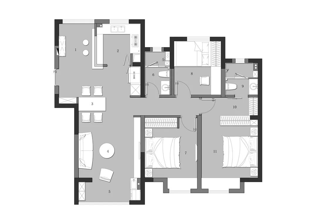 3.取消原主臥衣帽間朝向走廊的西側(cè)墻體,將主臥入口移至走廊東端,利用主臥東墻凸出的承重墻,重新設(shè)置了L形衣柜,將衛(wèi)生間和主臥動(dòng)線進(jìn)行分離。