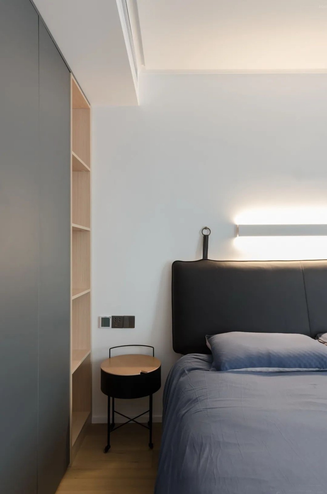 主臥空間,衣帽柜作為兩個(gè)功能區(qū)的屏障,借助承重墻的結(jié)構(gòu),衣柜東側(cè)作為開放式儲(chǔ)物區(qū)。合理解決了每一寸收納。